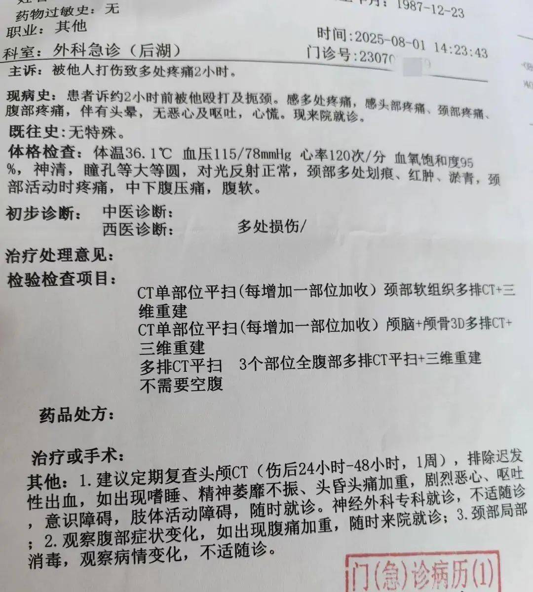 “做笔录期间,对方被叫到派出所,说我是碰瓷搞钱的。”李飞说,他在附近医院检查身体,诊断为心律不齐、颈部瘀肿和多处抓伤。